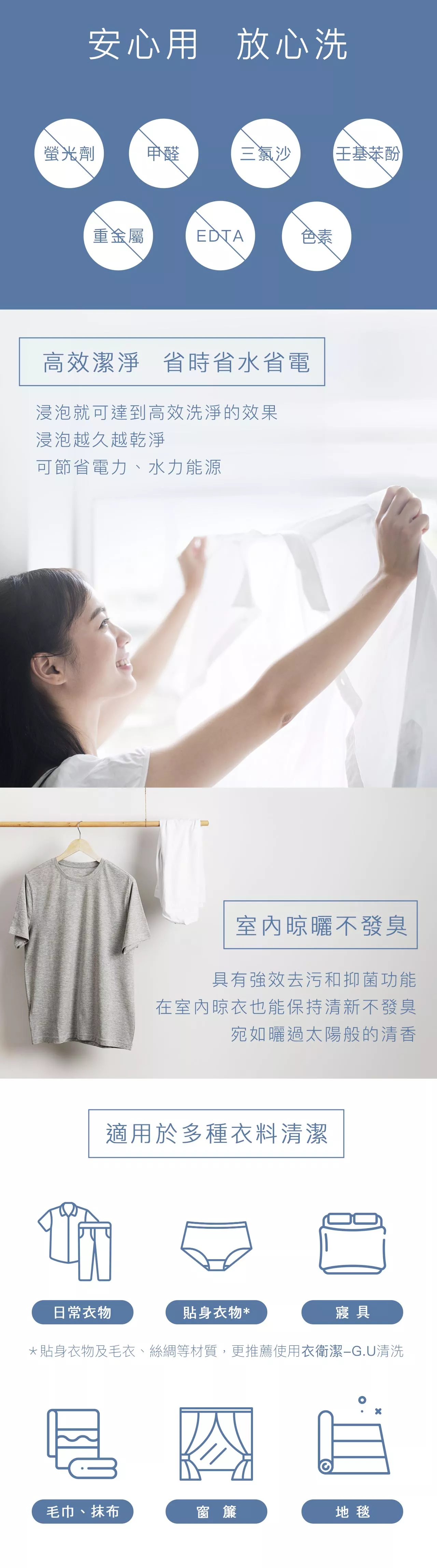 - 衣物自然膨鬆柔軟,不損傷衣物纖維,清洗後更乾爽,晾乾後猶如晒過太陽般清新。
