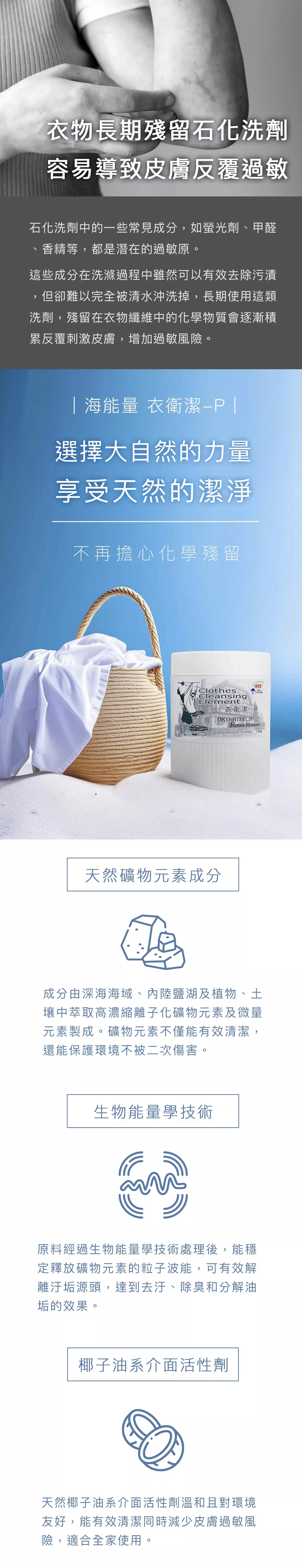 碳酸鈉(符合我國食品添加物標準規格)、椰子油系介面活性劑 (通過國際COSMOS Natural天然認證標章)、礦物鹽、海水萃取液、純水