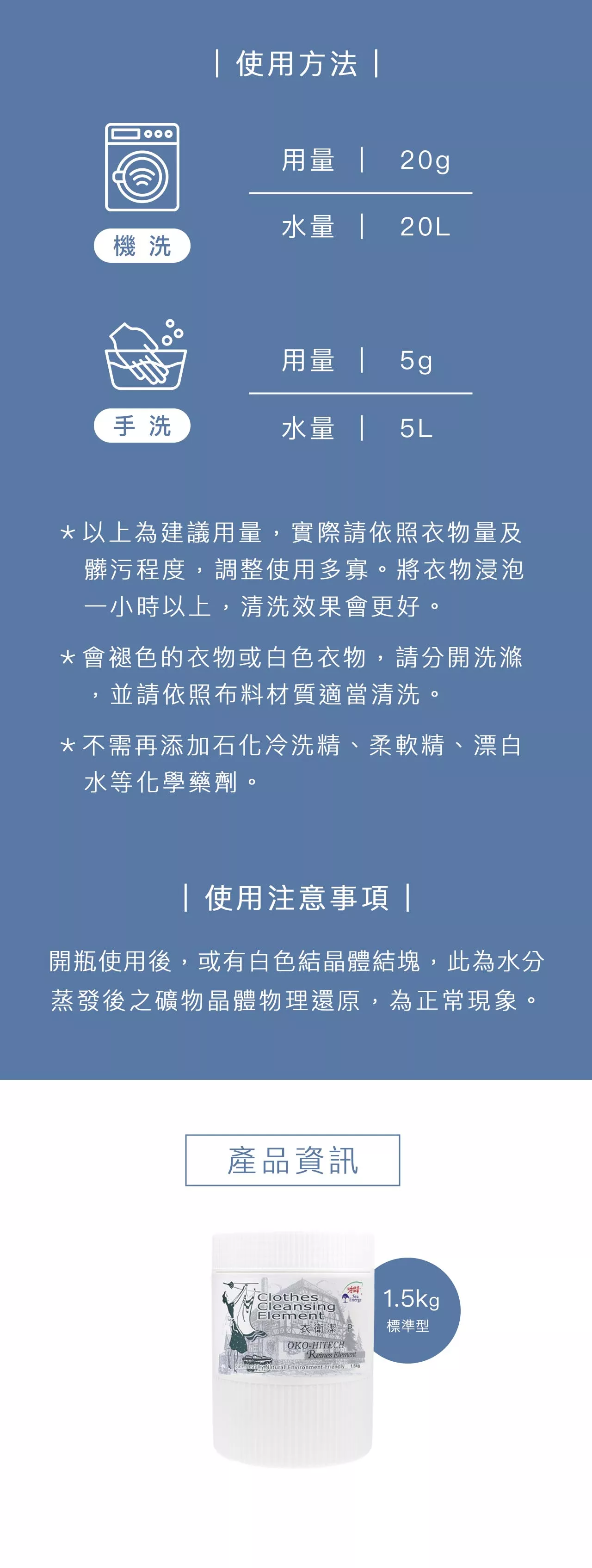 - 洗衣機:20公升水量,置入20g衣衛潔-P攪勻後,置入衣物洗滌,浸泡約1小時以上再洗滌效果更好。